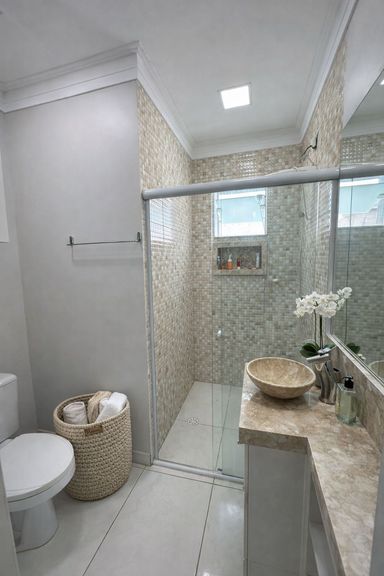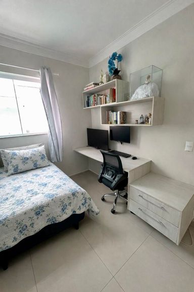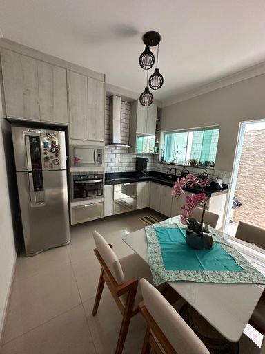 A cozinha é um grande diferencial, com armários planejados e equipada com forno, cooktop, coifa e micro-ondas, proporcionando praticidade no dia a dia. A casa dispõe ainda de 3 banheiros, área de serviço bem distribuída, 2 vagas de garagem e portão automático, trazendo mais segurança e comodidade.
