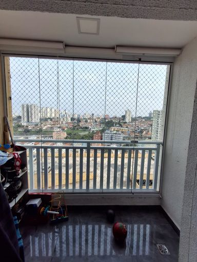 Sacada com fechamento em vidro e persianas