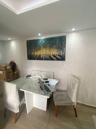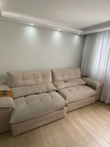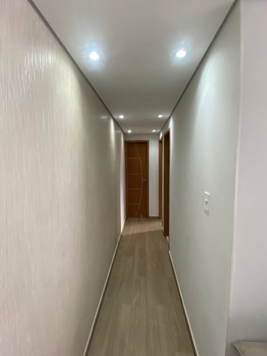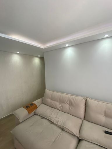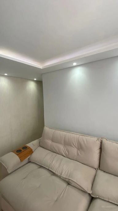 Sanca rebaixada em gesso com pontos de iluminação nos quartos e sala.