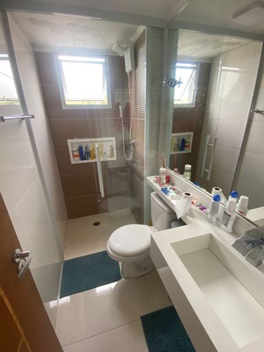 Banheiro totalmente reformado e com pia e piso porcelanato