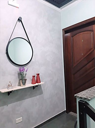A cozinha é ampla e funcional, com pia de granito em “L”, gabinetes sob medida e espaço preparado para fogão embutido. O apartamento também possui lavanderia separada, banheiro social moderno com box de vidro e chuveiro com ducha dupla bidirecional, além de 1 vaga de garagem coberta.